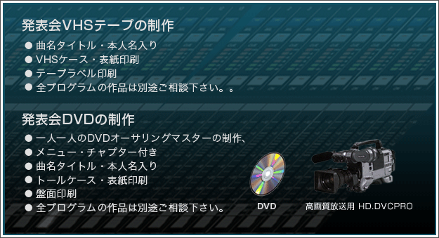 | 日本舞踊は、日本古来からの伝統芸能、踊りを通じて優雅な女性らしさを身につけていよいよ練習の成果を見せる発表会です。日本ビデオ企画では、この様な記念すべき大切なイベントを映像という形でビデオ撮影させていただきます。撮影は、一つ上行く高画質放送業務用DVDPROデジタルで収録編集いたします。お気軽にお問い合わせ下さい。 |